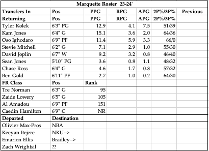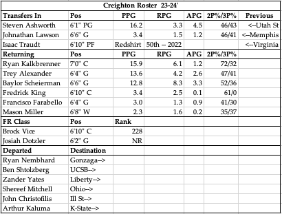 Creighton went on an awesome run to end last season once they got healthy, finishing the regular season 11-3 and getting to an elite 8. I have seen them picked at the top of this Conference this season, and while I don’t think that’s a crazy take, I just think the losses of Nembhard and Kaluma are a lot to overcome for a team that was extremely reliant on their starting 5. They don’t have much proven depth and didn’t do much to help that cause, adding just 2 guys in Steven Ashworth (Utah St) and Johnathan Lawson (Memphis). Ashworth does seem to fit seamlessly with this group and is a great addition to replace Nembhard, but the two candidates to replace Kaluma, Mason Miller and Lawson, leave a little to be desired. Don’t get me wrong, I have them 13th for a reason, that top 4 of Kalkbrenner, Alexander, Scheierman and Ashworth are as good as it gets in the Country. What worries me is the lack of depth, especially up front, as Kaluma was a huge presence not just in the scoring department but rebounding as well. My gut tells me they just go small with Lawson and Scheierman at the 3 and 4 and just ask their guards to help out rebounding but that’s going to make it tough. What they should continue to be though is a very good defensive team with Kalkbrenner as a shot blocking presence, and the ability to switch 1-4, they should repeat as a top-15 defense. Again, this is a really good team, I just see the lack of depth, with really only 8 guys and a lack of a true 4 man as two things that could really bite them in the butt. They should still be right in the hunt in this Conference and real threat to make noise in the dance though. Expectations are high, just maybe not as high for me as some others out there.
