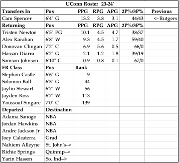 It’s tough to take the defending National Champs and slot them 4th in their Conference but with how good this league is and how much they lost from last year’s group, I really don’t see them contending on the same level. It looks like Hurley is taking more of a long game approach with this roster construction, focusing on top Freshmen talent and developing the young guys he had in reserve roles a year ago. The one new vet to come in is a perfect fit though, as Cam Spencer (Rutgers) is a sniper from long range and has balls of steel. As a Purdue fan I have first hand knowledge of Spencer’s late game heroics as I had to see it in person in Mackey arena as he hit a game winner against my Boilers last year, so UConn fans just know you got a killer. Next to him it’ll be vet Tristen Newton at the point, we all know him, and in the front court we have two breakout candidates in big man Donovan Clingan and Alex Karaban. Both were productive in smaller roles last year but they showed flashes of what could be a solid 1-2 punch up front. With all of that said, the real story this season is going to be the Freshmen class and how well they can play, because there’s only 6 guys back from a year ago, they’re going to need these young bucks. Leading the group is obviously top-10 recruit Stephon Castle. He’s going to remind you of a guy like Jaylen Brown or DeMar Derozan, an off-guard who excels at attacking downhill, despite not being the most explosive athlete, and he will also pull up in the mid-range with effectiveness. He hasn’t shown much prowess as a 3-point shooter yet, but in the open court is dangerous as a playmaker as he is a gifted passer as well. He should start alongside Newton and Spencer, and given his skillset could be a major playmaker for this offense in his one year with the program. The other two with a chance to carve out a role are Solomon Ball and Jaylin Stewart. Ball is a freak athlete, with a long frame and explosive bounce he’s obviously at his best in the open court, but he’s also shown ability to have knock-down catch and shoot ability from the left side. The last is Stewart who should 100% have a role behind Karaban at the 4 spot, as he can really do everything as a small ball 4, just isn’t an elite athlete or especially gifted in any one category. How well these three play will determine the ceiling of this team, as they will be reliant on them for some production. The top 4 are good, but they’ll need some help, and the youth and inexperience of this team is why I have them lower in the Conference rankings, but if the young kids develop by March they could be a dangerous team to face in the dance.