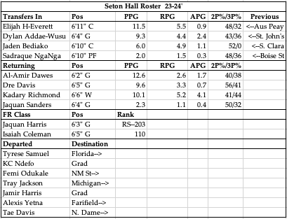 Year 1 under Holloway was pretty meh, as they were a very good defensive team but just couldn’t score the ball. They were on the bubble in early February but lost 6 of their last 8 games and were never really in contention for a bid on Selection Sunday. Most of that group is gone, with just 3 contributors back, but each of Dawes, Richmond and Davis were all pretty impactful so that’s a positive. Holloway went to the transfer portal to beef back up the interior, grabbing 3 guys 6’10” or bigger to go along with Addae-Wusu the guard from St. John’s. That returning trio should be a group that progresses, and if it does they should improve a little offensively. The weakness looks like it could be on the glass, as Kadary Richmond is likely going to need to play a small ball 4 with one of the transfers at C, who all played mid-major ball a year ago and weren’t exactly rebound monsters. I know that Holloway can coach defense, but the offensive struggles are what they have to fix as a program and frankly it doesn’t look like they brought in much firepower on that end. They are going to be competitive so long as they continue to defend like they did a year ago (20th), but I would imagine they will continue to struggle offensively. Best case scenario is that group of 3 all take a step forward and they’re a bubble team again, but my realistic bet is this is where we draw the line in terms of contenders to be dancing come March. I like Holloway, but he just doesn’t seem to have the talent right now and isn’t landing any via the transfer portal or the recruiting trail.