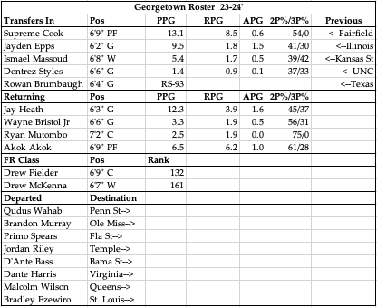 Ed Cooley surprised the college hoops world when he decided to leave Providence for Georgetown, as he had built a good thing with the Friars and Georgetown is a dumpster fire right now. Nevertheless, he comes to Georgetown with the hope of the history and tradition of the program giving him a higher ceiling. Year 1 doesn’t look to have much promise in terms of results though, with most of the talent leaving the program, maybe some addition by subtraction there, but Cooley did go out and get some young talent in the portal in a clear attempt at building for the future. All 3 of Epps, Styles and Brumbaugh were 4-star top-100 recruits and have multiple years of eligibility left, so that’s a solid base to work with if he can keep them around beyond this season. Cook and Massoud are older guys who can come in and provide productive minutes and hopefully be some bridge guys to get them a little more competitive. Most of the returning guys, outside of Bristol, are Seniors so they’ll be short term as well, but the 3 young transfers with the 2 FR is a solid base for Cooley to build around. Most of this is focusing on the future, and that’s really because I see the Hoyas struggling to really do much of anything this year. Not much high volume production in a league that is loaded with talent and tournament quality opponents. Maybe they pick up a couple of wins against the other guys in the bottom of the rankings, but this is a long term rebuild that in my opinion isn’t off to a quick start.