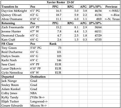 Xavier had missed 4 straight tourney’s prior to the return of Sean Miller, but he quickly put an end to that suffering, getting them in as a 3 seed and getting to the Sweet 16 despite the injury to Freemantle. Clearly this man can coach, and he’s going to have another challenge this season after losing 4 major contributors from last year’s group. I had to update this, as now both Freemantle and Jerome Hunter are expected to miss the season…Xavier is going to struggle much more given those two injuries, but the following guys still should make an impact. The pressure for Xavier is going to be on the play of the transfer guards McKnight (WKU) and Olivari (Rice) who will be trying to replace Boum and Kunkel from last year. Both of these guys were All-CUSA last season and high volume scorers, so on paper it looks like they can come in and be a very productive duo in the backcourt. Desmond Claude is also back after a FR year where he showed flashes and looks like he can fill the Colby Jones role nicely. The last transfer Ousmane (N. Texas) should be the primary big given the injruies upfront, he’ll need to play 30+ min per fame. They also brought in 3 international transfers, the best of which looks like Lazar Djokovic, who at 6’9″ is a good athlete but also can really shoot it, despite an unorthodox looking shot. He should come in and start alongside Ousmane. The last newcomer worth mentioning is Trey Green, who figures to have a role as a backup PG and comes in as an undersized guy that is an absolute sharpshooter. The trio of Boum, Kunkel and Jones was insanely productive, so it’s going to be hard to replace that and maintain that efficiency on offense that they relied on a year ago. They didn’t play much defense, so that’s what makes me concerned with this team, as all of that cohesion that results in a top-10 offense is going to be difficult to replicate. The injuries they’ve suffered pre-season likely knock them out of tournament contention, so it may be a rebuilding year for Xavier.