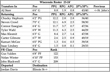 This Wisconsin team doesn’t have the ceiling of a team a la 2022 with Johnny Davis, but this group is as solid as it gets below that elite tier. I love the backcourt of Hepburn, Essigian, Klesmit and Storr as they are all really good shooters and Storr is going to help relieve some of the playmaking duties from Chucky in the half-court. Steven Crowl should continue to be a 10-15 point a game guy and alongside Wahl form a really good front-court. They were a top-20 team defensively last year, that’s not going anywhere, it’s going to come down to scoring the basketball consistently. If they can get more efficient, they can really compete with these top teams in the Big Ten, and maybe be right there battling for a Ship come late February. They are right there with Purdue and Sparty with returning talent, they just have to find a way to close the gap between them that existed a season ago. I don’t see them winning the Conference, but being right there as that 2nd tier in the Big Ten is my expectation. Wahl is the question mark, as last year was marred with injuries but it was a huge regression year, down from a 107 offensive rating to 93. He went from 57% from 2 to 42%. Much of that could be due to injury, and a return to his previous form could also help elevate this Badger team. So much promise, but there’s still that chance they can’t score and find themselves struggling once again to sniff the tourney. The criticism would be this is basically the same team that missed the dance altogether last year, what a joke putting them in the top-25. Well this is Wisconsin, they actually develop players and I trust their history of getting 3 and 4 star kids to get better and better every year, so I’m buying the promise.