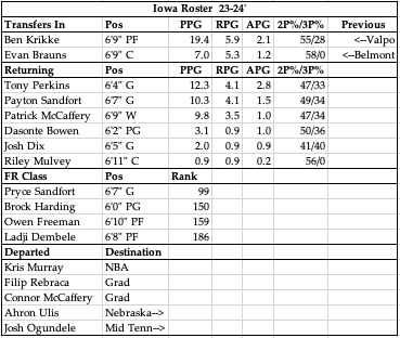 I am going to be upfront here, I can’t stand Fran McCaffery and this Iowa program. They always have talent, they can always score with anybody, but they just refuse to play any defense and consistently get bounced from the tourney despite everyone thinking they’re good. Purdue gets all the hate for March failures but McCaffery has been to 11 tourney’s (7 with Iowa) and has yet to make it out of the first weekend, he’s awful. Now, without Kris Murray they enter a season without a clear All-Conference type of guy to carry the load offensively, so I really think this will be the worst year at Iowa in some time. They have won 10+ Conference games 5 straight seasons, but I’m not seeing enough talent here for me to think this is going to go well. Ben Krikke (Valpo) is an interesting get from the transfer portal, as he averaged almost 20 ppg but he’s an undersized big that isn’t a great shooter, so i’m not sure how he’ll translate to Big Ten basketball. They have the Sandfort brothers who can stroke it from 3, and Tony Perkins is a bulldog, but again there’s no big time scorer to make up for their inept defense. I know I can’t be totally unbiased here, but I genuinely just don’t see how this could be anything better than 5 or so Conference wins for the Hawkeyes this year.
