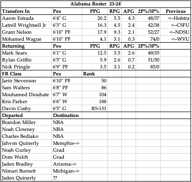 I do want to say from the jump I love the way Nate Oats sees the game of basketball and as long as I’ve been putting my thoughts out there on college hoops I’ve been beating the Oats drum. Layups and 3’s , fast-paced offense, if you’re open shoot it, and when we go to the other end it’s high pressure and you better be defending. Last year and 2021 they were top-5 defensively while playing at a top-10 tempo, that combo is unmatched in the college game and something I can remember hearing people say was impossible. “You can’t play fast and defend at an elite level”. “Quick shots lead to easy offense the other way.” Nate Oats says nah, we’re gonna play fast and defend at a high level and that’s what they’ve done and I love it. Now that I’ve gotten that off my chest we can look at why I have them lower than most pre-season. First off they lost a ridiculous amount of talent and frankly they just didn’t bring in as much as they lost. Yes Mark Sears is back, and the transfer guards Estrada (Hofstra) and Wrightsell (CSFU) were spectacular at the mid-major level, but the top end NBA talent is no longer here. Estrada is really good attacking the rim which is great for Oates, and Wrightsell is a good complement as he’s more of a set shooter than a playmaker. What worries me is your starting backcourt is 6’1″, 6’3″ and 6’4″ and then at PF you have Grant Nelson (NDSU) who is not the most athletic guy as he’s more of a pick and pop or back to the basket scorer. He had good rebound numbers but I’m worried how he’ll hold up in what is a very physical league. At the 5 is going to be some combination of young guys with FR Jarin Stevenson potentially leading the way. He has some Noah Clowney in him with the length and athleticism, but he’s not quite as good offensively and needs to beef up his wiry frame. Transfer Mohamed Wague may get the nod just because he’s physically more developed and still is athletic enough to run the floor and can block shots wchich is essential for a big under Oates. Nick Pringle is also back and he should factor in somewhere as he’s very athletic, and Rylan Griffin should be the primary guard off the bench. That’s their 8 really, with the rest of the roster being lower recruits that need time to develop. I look at this roster and it reminds me a lot of the 2022 Bama team that was 19-14 and lost round 1 as a 9 seed. They played 3 guards under 6’4″ and had a very unproven and ultimately not very talented front court. They were 92nd defensively and one of the worst defensive rebounding teams in the Country, and that was their undoing. I see a very similar fate for this Tide group, so while the computers have Bama top-15 or even as high as 10th (Kenpom) I doubt this is a true top-25 team and they’ll likely be on the bubble come February. Still love Oats, he just has a huge challenge ahead of him.