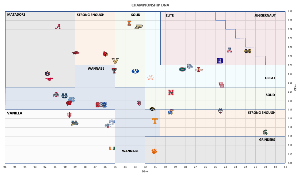We are still going to be upsetting UConn fans as they linger down away from the top contenders, but I want to mention I still have them as a 1 seed in the tournament. This is not a resumé tool this is just an analytics based look at where teams stand compared to historical results. The Huskies offense simply needs to improve for them to be considered more reliable, it is a vulnerability at this stage those other teams don’t have. Next, we have to talk Vandy, who has now dropped 3 in a row and slid from borderline Elite to the triad of Wannabe/Strong Enough/Solid. The data doesn’t know what to make of them anymore than I do, but one thing is for sure, defensively they have regressed with the increased competition in the SEC. Nebraska is trending in the other direction, moving closer and closer to Great territory as they remain undefeated. That matchup with Michigan looms large next week, but even a close loss would cement them as a true contender. Speaking of Michigan, the Juggernaut Watch is taking a pause for a week as they fell below that > 50 Net++ spread, while Arizona continues to inch closer themselves. Lastly, we have to mention Virginia again, as they have made one of the largest jumps we’ve seen, moving all the way into Great territory after being a Matador in our 1st edition. Massive improvement defensively, even with the jump in competition in the ACC so shoutout to Ryan Odom and the Hoos. That about does it so until next week, enjoy the hoops.
