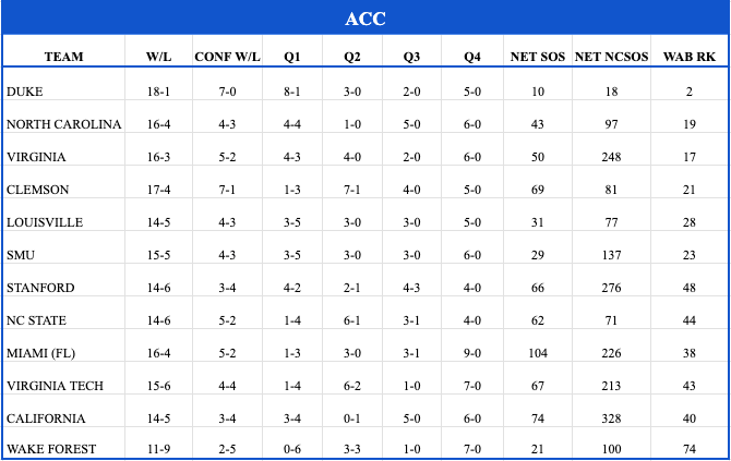 The Miami Hurricanes are quietly putting together a nice season after spending a few years in the cellar after that 2023 Final 4 run. Jai Lucas has come in and seemingly brought some stability and consistency already in year 1, and having them 16-4, with more wins that each of the past 2 seasons already, you have to say it’s a success already. I think most fans would immediately recognize the top guys on this roster, as Reneau (Indiana), Donaldson (Michigan) and Washington (N. Mexico) were all very relevant a season ago and have come together and played really well so far. Now all of that glazing can’t go without mentioning the recent skid that saw them go to Clemson and lose (no real shame there) but then drop an inexcusable one to Florida St at home. That put me on alert, but I was encouraged again to see them follow that up with a road win over Syracuse. No panic from me yet on these Canes, but the reality is while the computers are high on them they have just 1 Q1 win @ Wake. Overall they are 4-3 in Q1/2, but you’re going to hear me pound this drum all throughout the Watch. If you want to be in the Dance you have to pick up a big time win at some point. I’m circling home dates with UNC and Louisville later on as prime chances, but they’ll need to stay focused until those come along, starting this week with fellow bubble teams Stanford and Cal coming in. Gotta hold serve.