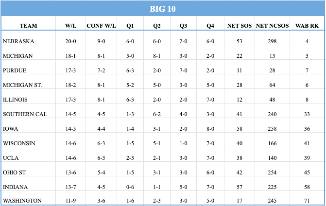 This year’s Badgers got off to a clunky start at 7-4 by mid-December, but then they ripped off a 7-1 stretch including what has to be the best win of any team on the Watch as they went to Ann Arbor and beat Michigan. The hype train had the brakes slammed on it yesterday though as they lost a home game to USC, a Q2 loss that makes everyone take breath. We’ll assume that was just a minor bump in the road, but it certainly go my attention and cooled my tone for this blurb. The duo of John Blackwell and Nick Boyd are still leading the way for a new look Wisconsin team that is filling it up offensively but struggling to get stops. Not quite the recipe we’ve been used to with a Greg Gard led team but they’re 6-6 in Q1/2 which has them firmly in the 8-9 seed range. Their issue is mainly the 1-5 Q1 record, but again when that 1 is a road win over #2 ranked Michigan you certainly feel confident. I still think they’ll need to add another quality win or 2 to truly feel safe, and they’ll have prime chances with Michigan St and Iowa both coming to the Kohl Center in February. Of course they’ll have plenty of road chances as well, but however it comes I can guarantee you it will be an uneasy feeling without that Q1 win total getting to 3 or 4 by Selection Sunday. This week they need to bounce back, with home matchups with Minnesota and Ohio St just what the doctor ordered.