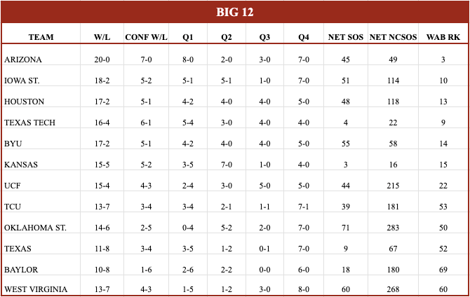 Is Darryn Peterson healthy and playing? That’s the defining question for the Jayhawks’ season so far, and while it hasn’t been a total disaster when he’s not in there, the mysterious nature of his lineup inclusion/absence has made this essentially the only thing people are talking about. That and the fact he could be the #1 pick in the draft and is as fun a watch as the sport has to offer. The relevant news for the tournament and seeding is that they’ve acquitted themselves well in his abcense, going 6-2 in those games including the Q1 win over Tennessee. With him, it looks like they could be one of the more dangerous teams in the tourney, with the size and athleticism to be lock down defensively. The ancillary guys have also gotten better around Peterson, so if he can get healthy again I would not want to see the Jayhawks in March. Overall they are in solid shape, with 3 Q1(A) wins and a 10-5 Q1/2 record. It also sounds like Bill Self believes there’s a chance Peterson is back for their lone test this next week, a massive one @ BYU. A huge litmus test if he’s fully healthy, and must watch TV with the presumptive top-2 picks going head-to-head.