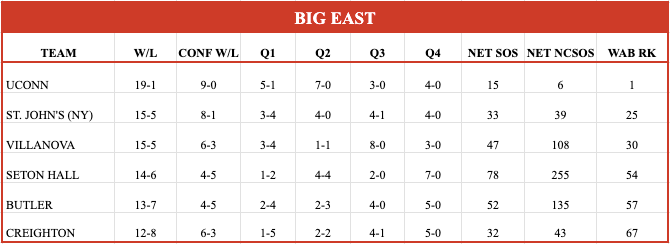 At this point we can confidently say Nova is the surprise of the season in the Big East, as the roster for Kevin Willard in year 1 didn’t exactly jump off the page, but they’re clearly the 3rd best team in the Big East this year. They’re a balanced team with 6 guys averaging double figures so it’s not like Willard just leaned on one big portal grab, it’s a team full of guys who are buying what he is selling and playing together. They just took UConn to OT, falling on the road, but that shows you what stuff they’re made of being able to take the clear top dog in this conference to the brink. Their main issue, which is the issue of many bubble teams right now is the lack of a top tier win, as the best one is on a neutral court vs Wisconsin. This is a year where 1 truly great win could be a separator, so for them it’s going to be about big game hunting, with UConn coming to PA and then a trip to St. John’s being the marquee chances. If they don’t get either of those, I would imagine this is going to be close as we come down the stretch. They’ll play just one time until we meet again and that’s at home vs Providence, simply a must win as they can’t afford to add an ugly Q3 loss to what is already a paltry 4-5 Q1/2 record.