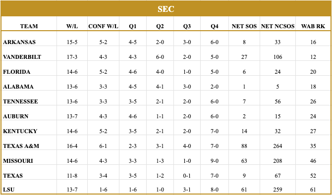Bucky ball is alive and well in College Station, but I bet even he would’ve been skeptical of the idea they could be leading the SEC outright at almost the halfway point in conference play. They play small, fast and launch 3’s. That’s Bucky ball baby. They may not have the top end names we would expect to see, but credit to McMillan for finding guys to fit his style and getting them to gel and play this well. Some may doubt them the way they doubted Vandy, but how can you really say that at this point when they’re sitting at 6-1 in the SEC? You could criticize the schedule, but they’ve beaten Auburn and Texas on the road, nothing to scoff at. It really doesn’t seem like there’s a dominate team in the league, so at this point it seems they have as good a chance as anyone to win it. So far the resumé doesn’t have that strong signature win at the top, but they do technically have 2 Q1(A) wins despite being just 5-4 overall in Q1/2. The SOS numbers are the issue, but I don’t see long term that being too much of a hindrance with 11 more SEC games to go. They only play once this week and it’s a trip to Georgia, so we may have a bit of different tone next week if that goes south. If they win however I think it’ll really be time for people to start paying attention to the Aggies.