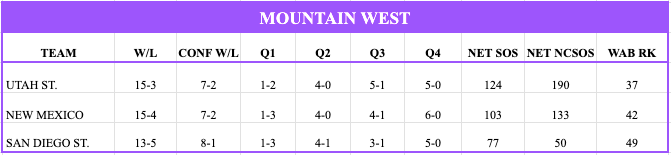 The Utah St athletic program has an uncanny ability to identify and hire rising head coaches, and after sending Craig Smith to Utah, Ryan Odom now at Virginia and then Danny Sprinkle to Washington, I can only think, where will Jerrod Calhoun end up? The impressive part even beyond that is they’ve made the dance in 6 of the 7 years under 4 different HC’s and look poised to make that 7/8 in Calhoun’s 2nd season. Calhoun’s Aggies have plenty of contributors, but they’re really a 2 headed monster behind familiar face Mason Falslev and transfer MJ Collins. Both of them are 16-19 ppg and are the clear go-to guys, but collectively they’re making for a pretty good defensive unit as they’re top-10 in forcing TO’s. They just struggle on the glass a bit which is dragging that defensive efficiency number down. In terms of big time wins that’s where we start to lose the plot a bit, as they have just 1 Q1 win and it’s barely in there as a road win over Boise St (63). Overall the best team they’ve beaten per the NET is VCU (53). That makes it tough when arguing for at-large positioning. While the computer rankings like them, that can’t be all you have when you head to Selection Sunday. It may end up being the non-con simply wasn’t strong enough for the Aggies, but right now they’re closer to a St. Louis resumé than people probably realize. This week they have a chance to improve on that though as they get San Diego St, which would be the highest ranked team they’ve beaten. Critical for not only the conference race but for resumés as well.