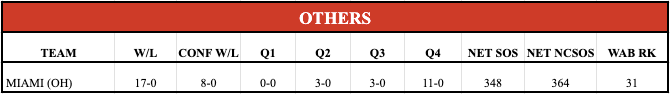 The emerging story of college basketball are your Miami RedHawks who have, seemingly out of nowhere, gotten off to a 20-0 start to this season. They are a very balanced group with 5 guys averaging double figures so credit to HC Travis Steele who has recruited and developed many of these guys, with only a couple of transfers who also were here last season. It’s a great mid-major story, and nice to see considering how top heavy the sport is feeling in the portal/NIL era. Now, I hate to take the air out of the balloon, but I’m sure you’re aware at this point the schedule is Charmin soft, which unfortunately is very bad news when it comes to evaluating them for an at-large spot. I have already heard the discussions beginning to take place about what would happen if they run the table and then lose in the MAC tourney. Similar to St. Louis, I have very little hope that the committee would give an at-large spot to a team without a top-50 win. They would have benefitted greatly from a trip to Akron, but unfortunately their only matchup with them was at home and is just a Q2 win. It would be an unprecedented resumé I will admit, but it is likely they would be stacked up next to high major teams who would likely have several top-50 wins. The only way I see it happening is if it’s a close loss to Akron, and even then they need the other bubble resumé’s to be weak. We’ll of course be tracking this week by week, but I know I’ll be rooting hard for the Miami (OH) at-large conversation to be moot come Selection Sunday.