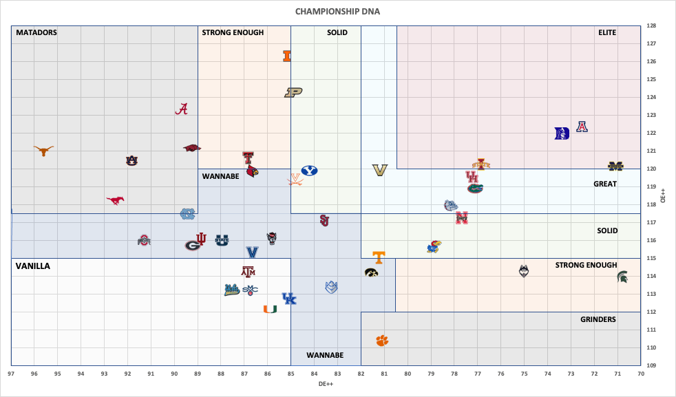 Now that we’re 7 weeks into this thing and teams have collected over 20 data points from individual games things are starting to settle in a bit. There are 8-9 teams that are oscillating from Elite to Great to Solid, with Nebraska emerging of latest to toe the line. Vandy is back, Virginia has faded, but overall we’ve been looking at a group with Arizona/Duke/Michigan pacing this thing for a while now. Iowa St/Houston/Gonzaga/Florida have been the next tier with a few others joining/fading. That to me looks like the top two tiers in the sport, with 3 in tier 1 and another 4 in tier 2. The one additional point I’d like to highlight is the nature of this thing not being a power ranking but a stylistic analysis of historical results. The key there would be teams like Michigan St and Illinois who from a ranking perspective are higher up than teams positioned better than them on this graph. The reason I keep harping on is vulnerabilities. Michigan St on offense and Illinois on D are both weak, which represents a reliance on one end of the floor. There have been teams able to overcome that and go deep, but with less reliability than the balanced teams like Vandy/Florida/Nebraska. That is what we’re doing here. Pointing out, with historical proof, that teams that rely on one end of the floor have a vulnerability that can crop up and burn them in a single elimination tournament.