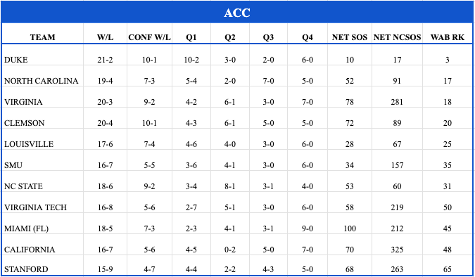 Well we’re officially in the disaster scenario I described last week as Stanford failed to beat Clemson at home and can now only improve their Q1 record away from home the rest of the way. We’re not going to completely give up on them since they ended their 5 game losing streak with a 23 point drubbing of GA Tech. Ebuka Okorie was special in that one, leading the way with 40 points to at least get them back above water. Right now they are pretty far out of it, but we have to at least lay out the path, as they do still have the 4 Q1 wins, I just think the committee likely is going to take the Chisom Okpara injury and the fact they are just 2-5 since then into account. Just like we saw with West Virginia last year, the committee is perfectly willing to throw out big time wins if they occurred with a key player a team no longer has at their disposal. Does that include bad losses though? That’s the unique dichotomy of this Cardinal resumé right now, but either way I can’t see a path forward without them going on a run here down the stretch. It starts with trips to Boston College and Wake Forest this week. BC is awful, and Wake is reeling after looking somewhat competent earlier in the year. Gotta have a 2-0 week to keep the dream alive.
