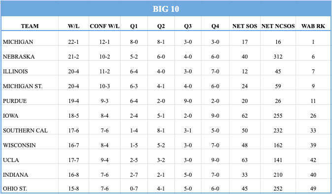 We said this week had to be a get right week for the Bruins and they accomplished just that as they de-pantsed Rutgers and then fought tooth and nail in a tight win over a desperate Washington team. Donovan Dent continued his strong play with 2 double doubles as he continues to get comfortable running the point for Mick Cronin. The next 3 games for UCLA are going to set the tone for the homestretch as they play @ Michigan/Michigan St and then host Illinois. A brutal stretch that almost all teams across the Country would go 0-3 in, but the reality of that would mean the Bruins dropping to just 2-8 in Q1 and overall just 5-10 in Q1/2. That would likely send them spiraling down to the cut line as they could be hovering around Dayton or the NIT. It is brutal, but if that is the way it goes they can’t let that be their undoing, as they have opportunities to bounce back afterwards. It would likely make their final 4 games must-win, but if we’re being honest that looks to be the most realistic path forward, short of upsetting Illinois in Westwood. Anything is possible of course, but they would get the chance to take out Nebraska at home March 3rd, so one of those 2 Q1 home games certainly need to be a win to get the Bruins in a somewhat comfortable position. They have a break so they don’t play again until Saturday, in Ann Arbor. Good luck to ya there.