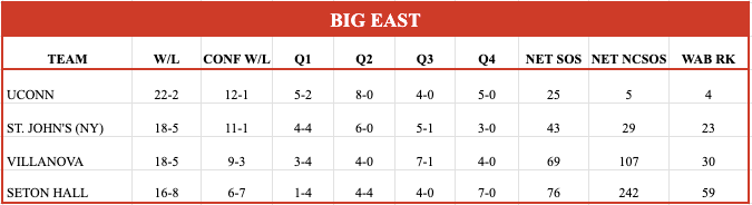 The Johnnies are now knocking on the door of locking up after that massive win over UConn on Friday night. What a wonderful display of college hoops that was as the Garden was rocking and 2 great HC’s were going at it with 2 great teams. What Rick Pitino has done with this group needs to be discussed, as in November this group was a hectic disaster that wouldn’t have come close to beating UConn. They have steadily improved and gotten to the point they are a legit threat as they have found a defensive identity and an intensity on the glass behind the trio of Ejiofor/Mitchell/Hopkins. They now have won 9 games in a row, and while the Big East isn’t going to allow them to climb up the seed list like maybe their talent profile would suggest they are going to be a scary opponent in March. Speaking of resumé that win was massively important as they picked up a Q1(A) win that was their 4th overall Q1 win to give them plenty of breathing room. They now are at worst on the 6 seed line with maybe potential to get to a 5 seed or so, but with just 2 Q1 chances left and a Q3 loss out there already I’m not sure how high 6-4 would get them. They won’t be overly concerned about that though, as they need to keep grinding and avoiding the land mines that exist around every turn in the Big East.
