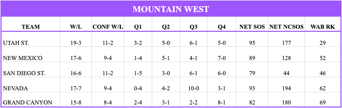 What a monumentally disastrous week for the Lobos this week as they not only got their teeth kicked in by Utah St in their lone remaining Q1 home chance they then lost Boise St at home. They are now facing a tough challenge going forward as they fall to just 1-4 in Q1 and picked up a 2nd loss outside of Q1. They still are 5-1 in Q2 which is solid, but that blowout at the hands of Utah St was really the kicker, as they could’ve really used that 2nd Q1 win to put some space between them and the true cut line. Now they are right in the cross-hairs as their best wins are over VCU and Santa Clara, two other mid-majors fighting for their chances at an at-large. It’s not nothing, but no top-40 wins puts pressure on the Lobos to try and add to the resumé, and certainly means they can’t afford to only stack L’s in Q1 the rest of the way. It starts this week with a trip to Grand Canyon, but they also have San Diego St at home and trips to Utah St/Nevada still on the docket. Some variety of a 2-2 split there feels like the bare minimum to stay on the right side of things, so we’ll see how they get started with that this week as that trip to Phoenix is their only game until we meet again.