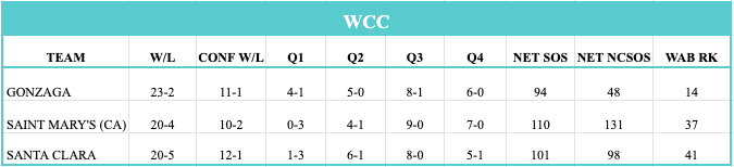 We have finally reached the most important week of the season for Santa Clara as it’s Gonzaga week. We first need to give them credit for staying focused and picking up two tricky road wins over Pacific and Wazzu. While those won’t move the resumé needle they avoided adding bad losses to sub-100 ranked teams which is very important given their position right now. We have been counting down the days until this matchup with the Zags as they desperately need that top end win to hang their hat on. They are perfectly teetering right now as about half of prognosticators have them in, while the rest have them just on the outside. It really does all come down to winning this game, as it would put them in prime position to get in with a monster Q1(A) win to hold over the rest of these bubble teams. A loss though, and they’ll be forced to try and win @ St. Mary’s after that to try and pick up a signature win to bring to the table. They first need to hold that focus for one more game against a feisty Seattle team in as big a trap game as you can have. A 2-0 week and we’ll be coming to you next week with Santa Clara solidly in the field I’d say. What a moment for Santa Clara fans and more importantly for Herb Sendek and these players. We’ll see if they can rise to the occasion on Saturday night, as not only could they position themselves to get into the dance for the first time in 30 years, they have a shot at winning the WCC regular season title.