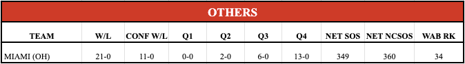 The biggest story of college basketball right now are your Miami RedHawks who continue to roll through their schedule as they are now 24-0. They are a very balanced group with 5 guys averaging double figures, so credit to HC Travis Steele who has recruited and developed many of these guys, with only a couple of transfers who also were here last season. It’s a great mid-major story, and nice to see considering how top heavy the sport is feeling in the portal/NIL era. Now, I hate to take the air out of the balloon, but I’m sure you’re aware at this point the schedule is Charmin soft, which unfortunately is very bad news when it comes to evaluating them for an at-large spot. I have already heard the discussions about how there is no way they can be left out if they only lose once or if they go undefeated until the MAC final. But are we actually sure about that? Right now I have very little hope that the committee would give an at-large spot to a team without a top-50 win. They would have benefitted greatly from a trip to Akron, but unfortunately their only matchup with them was at home and is just a Q2 win. It would be an unprecedented resumé I will admit, but it is likely they would be stacked up next to high major teams who would likely have several top-50 wins. The only way I see it happening is if it’s a close loss to Akron, and even then they need the other bubble resumé’s to be weak. I just don’t see how they would justify to SEC/Big Ten teams who have played a gauntlet of a schedule that a team who played 0 Q1 games is going to get in over them, especially with the metrics evaluating them as only around the 50th best team. Your only argument is they just didn’t have the chance, but if they lose at any point in Q2, what makes me think they could compete in Q1? That is not what I desire the answer to be, as I think it’d be more fun to have them in, but I just can’t see the committee doing it. I hope we don’t have to find out if I’m right.