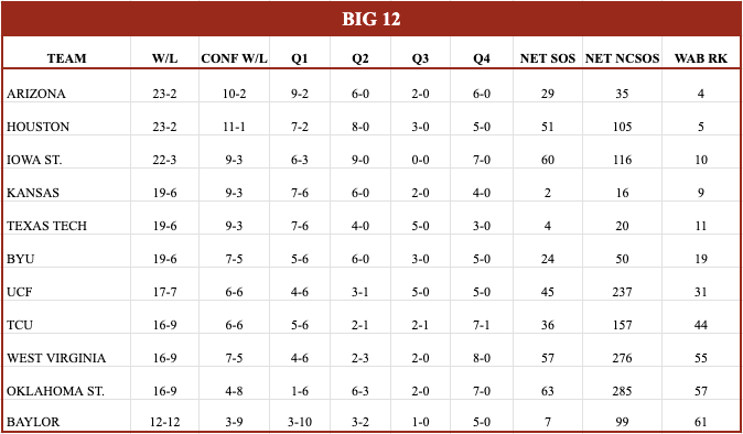 I was a bit pessimistic about the Mountaineers last week but they pulled a rabbit out of their hat on Saturday and beat UCF in Orlando to really jump back into the thick of these conversations. Jasper Floyd and Honor Huff combined for 38 points in what was close to a must-win as they really would have fallen pretty far out of the hunt if they dropped another one. They still aren’t on the right side of things, being under .500 in both Q1/2 isn’t going to get it done, but they have chances left with 5 of 6 either Q1/2 down the stretch. They control their own destiny, and at this point that’s all you can ask for when you’re a team who had very little expectation to be in this position heading into November. They own a win over Kansas to add to that win @ UCF along with 2 other Q1 wins, it’s just that 2-3 Q2 record that needs work. Every win is critical when you’re in this position, but they don’t have to run the table to get in. Beat Utah first this week and then maybe you steal one @ TCU. If not, they still have BYU/UCF at home and K-State on the road. Win those three, or even beat Oklahoma St in Stillwater, and they’re going to be in a great spot. All of that is just a projection though, as spots can dry up with bid stealers and/or suprising runs from other bubble teams. So however you slice it, they’re on the ropes.