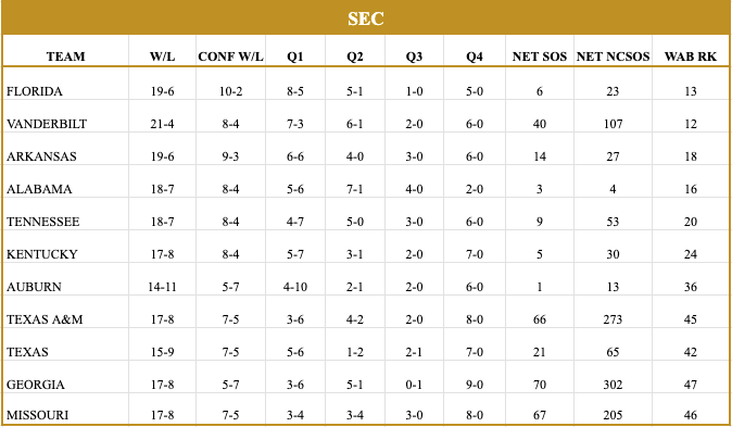 Not a huge update for Kentucky this week as they only played @ Florida, a 9 point loss in a game they never led. They did battle hard, but Florida is rising to another level right now, so it’s certainly not a bad loss and they remain right on the 6 seed line in solid position but not quite lockable yet. They have the 5 Q1 wins, with 3 of them Q1(A) so it would take a monumental collapse to completely miss out, we just want to see a little more in order to lock em up, 17 wins after all wouldn’t be a guarantee. They have a fairly straight forward game vs Georgia this week in a perfect bounce back spot before they go to Auburn in what will be a massive one for the Tigers. I’ve said it previously but this time of year is ripe with upsets because of the difference in mentality, and that will be on display for Kentucky this week as they aren’t playing for their tournament lives the way Georgia and even Auburn is right now. Both of those teams are going to be hungry for wins, so UK has to match that hunger to avoid a disappointing 0-2 week. I don’t see Georgia rolling into Lexington and winning, but we can’t forget Mizzou did exactly that 6 weeks ago. They clearly picked up their level of play since then, going 8-2, but they just can’t let themselves slide back into that laissez-faire mentality again. All of that to say, the Wildcats are on the verge of locking, just some caution for at least one more week.