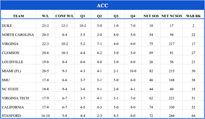 Stanford and their hope of an at-large bid are now on life support as they lost yet again on Saturday, this time @ Wake Forest. They are now just 3-6 since Chisom Okpara was lost to injury, and barring a major run down the stretch this write up is all for not. However, that path still does exist, even with the low probability of success, they still have 4 Q1 wins and overall are 6-7 in Q1/2. They do have the 3 Q3 losses they are trying to overcome, but the schedule still offers enough for there to still be a chance, albeit very slim. I’m looking for a 4-1 finish bare minimum for them to stay in the race, as that would give them 2 more Q2 wins to lift them to 4-3 there and then they’d also grab 1 Q1 win to finish 5-5 there. At 9-8 with 5 Q1 wins they would have to be in consideration, even with the 3 Q3 losses. That kind of run would also hopefully give them a strong enough case without Okpara to not be discarded simply because of that injury, a la 2025 West Virginia. It’s a long perilous road but it’s a workable path nonetheless, and it starts this week with a trip to Cal. That’s their only game, and a loss wouldn’t knock them out but it would mean they would have 0 margin for error the rest of the way. How about that for pressure? Such is life on the bubble.