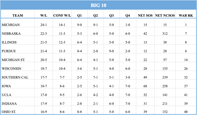 The Bruins played just once this week and it was a humbling trip to Ann Arbor as they got pummeled in the 2nd half, losing the game by 30 after trailing by just 2 at the half. They got an in person glimpse at what it looks like for the apex predator to unleash his full might on you, and it turns out they aren’t much of a match. While that isn’t too big of a surprise, it’s not too relevant as we’ve seen team after team fall victim to the Wolverines in a similar fashion, and at the end of the day for UCLA it’s just another Q1 road loss. They stay right there on right side of the bubble, part of my Last 4 Byes group as they have a tiny gap between them and the real tension point with the Dayton/NIT bound groups. Things are not going to get too much easier this week as they head down the road to Michigan St next and then return to LA to host Illinois. Quite the 3 game stretch, but if they can come away with 1 W in those 3 they will have widened that gap a smidge more. I’m circling the Illinois game at home obviously, but Michigan St has looked very vulnerable lately, so both are possible, even if unlikely. The most likely honestly at this point is that they go 0-2 this week and slide into the danger zone as that would drop them to just 2-8 in Q1 and overall just 6-10 in Q1/2. If that is what happens they’ll be right in the crosshairs of the bubble cut line with 4 to go. So, while it’s 2 very difficult games in order to go dancing you have to earn your way.