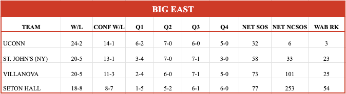 Villanova is just cruising along right now, handling their business while adding bits and pieces to their resumé as they continue to add at best Q2 wins. This week it was a home win over Marquette, good for nothing, and then a road win over Creighton which brought them to 6-0 in Q2. That’s just life in the Big East right now as basically all you have are UConn and St. John’s to try and knock off. They are 0-2 in those games thus far, so as we’ve said they’re just trying to avoid black stains on the resumé until they get the rematches with those 2. This week marks the first chance at revenge as they host UConn on Saturday. They went blow for blow with them back in January in what was ultimately an OT loss. They have to navigate a tricky trip to Xavier prior to that, so they can’t get caught looking ahead in that one as the Musketeers are frisky, just ask St. John’s. Saturday is the date we’ve had circled for weeks now though as it’s the last home Q1 chance left and the only one aside from a trip to St. John’s. It’s not a must-win by any means, Nova has 2 Q1 wins, but none of them are Q1(A). So suffice to say a marquee top-10 win would be just what they need to stave off any real bubble danger come Selection Sunday.