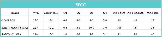 I feel for Santa Clara as I’m writing this, as they really did go blow for blow with Gonzaga on Saturday night, they just couldn’t get enough stops down the stretch to pull out a win. They were able to score with them for the most part, it was just the Zags’ athleticism was too much, as they lived in the paint, getting to the line and shooting 72% on two point shots. It was a valiant effort, that really had them pass the eye test for me in terms of being a tourney team, but we all know it doesn’t just come down to that on Selection Sunday. They now sit 1-4 in Q1 and 6-1 in Q2, which is pretty strong. The issue is the Q2 wins are on the weaker side, with the best really being the road win @ Xavier. The race for the last couple of spots is likely going to come down to mid-majors with clean resumés that lack top end wins vs power conference teams with a host of losses outside of Q1 but some big time Q1 wins they can hang their hat on. Generally I would lean toward the committee rewarding the big wins, especially Q1(A), but Santa Clara isn’t completely out of it right now as they still have another Q1 chance as they can sweep St. Mary’s next week. I’m sure the feeling is a bit deflated heading into this week but the reality is there’s still a path, it’s just likely going to take one more big win after what should be a win @ San Francisco this week.