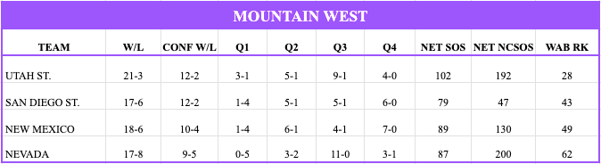 The Aztecs were able to continue to keep pace with Utah St in the conference race this week as they picked up another win over Nevada at home, keeping them tied atop the MWC at 12-2. Unfortunately, the don’t quite have the resumé that the Aggies do at this stage, so they are right there see-sawing back and forth from Last 4 In to First 4 Out, depending where you look. It’s hard to have a team whose best wins are over Nevada/New Mexico. It’s not a great group of wins thanks to them really struggling out of the gate and losing all of their tough non-con games. They have 3 more Q1 games that we’re going to have circled, as they host Utah St and go to New Mexico/Boise. If they can win 2 of those games and jump to 3 Q1 wins I would feel confident in having them in, especially if it’s a win over Utah St which would be their highest ranked win to date. If that’s the only one they grab they’d have an outside chance, but would still just be 2-6 in Q1, not great. So, I’m looking for a 5-1 finish from the Aztecs to feel like they have a good chance heading into conference tourney week. This week they just need to hold serve as they get Grand Canyon at home and then go to Colorado St.