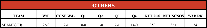 The biggest story of college basketball right now are your Miami RedHawks, who continue to roll through their schedule as they are now 25-0. They are a very balanced group with 5 guys averaging double figures, so credit to HC Travis Steele who has recruited and developed many of these guys, with only a couple of transfers who also were here last season. It’s a great mid-major story, and awesome to see considering how top heavy the sport is feeling in the portal/NIL era. Now, I hate to take the air out of the balloon, but I’m sure you’re aware at this point the schedule is Charmin soft, which unfortunately is very bad news when it comes to evaluating them for an at-large spot. I have already heard the discussions about how there is no way they can be left out if they only lose once or if they go undefeated until the MAC final. But are we actually sure about that? Right now I have very little hope that the committee would give an at-large spot to a team without a top-50 win. They would have benefitted greatly from a trip to Akron, but unfortunately their only matchup with them was at home and is just a Q2 win. It would be an unprecedented resumé I will admit, but it is likely they would be stacked up next to high major teams who would have several top-50 wins. The only way I see it happening is if it’s a close loss to Akron, and even then they need the other bubble resumé’s to be weak. I just don’t see how they would justify to SEC/Big Ten teams who have played a gauntlet of a schedule that a team who played 0 Q1 games is going to get in over them, especially with the metrics evaluating them in the mid-80’s per the prediction metrics like Kenpom. Your only argument is they just didn’t have the chance, but if they lose at any point in Q2, what makes me think they could compete in Q1? That is not what I desire the answer to be, as I think it’d be more fun to have them in, but I just can’t see the committee doing it. I hope we don’t have to find out if I’m right.