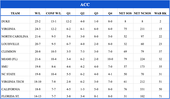 The Hokies had a season changing win slip right through their fingertips this past week, as they went to Miami and blew a late 3 point lead. Tre Donaldson hit a 3 with a minute left to tie the game, then the Hokies turned it over and fouled Donaldson sending him to the line where he hit 1/2. Down 1, the Hokies had a chance to reverse their fortune, as they’d already lost multiple games in the last seconds this year, but Ben Hammond was unable to get a buzzer beating runner to go and VA Tech once again lost in the final seconds. They were able to bounce back from that loss and beat Wake at home, but they still sit just 2-8 in Q1 as they desperately need to add one more to get on the right side of things. It has been a brutal season full of what if’s and blown chances, but at the end of the day they are still alive and still have a chance to flip the script. They have trips to UNC and Virginia left, with a game vs BC in between. The way I see it they need a 2-1 finish to be on the right side of things entering the ACC tourney. If they can’t find a way to steal one of those road Q1 games they will fall to 2-10 in that category and need a huge run in the ACC tourney to have a chance. It’s an uphill climb, but maybe they can catch UNC without Caleb Wilson and steal one. It’s a dire situation, but at the end of the day you just have to be happy to be alive, as hard as that is given all that has transpired this season.