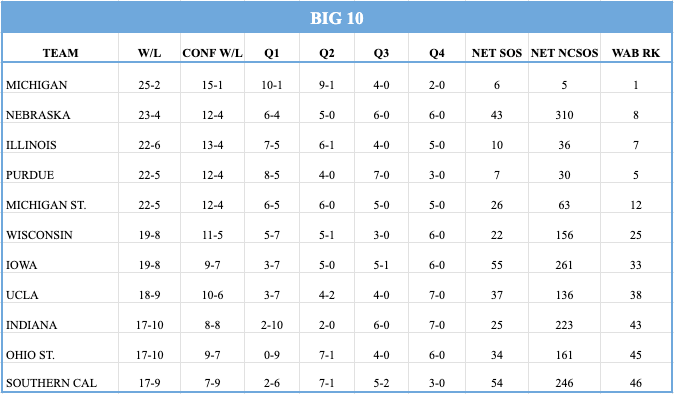 The Trojans are in absolute free fall right now as they not only got their teeth kicked in by Illinois in what was a great chance to notch a big time win at home, they followed it up by losing by 1 to lowly Oregon for a devastating Q3 loss (their 2nd). I now have them barely in the field, although I would understand if you had them out, the margins are very thin. What I like about the resumé is they have the road win over Wisconsin as the highlight and then 4 more wins away from home that are Q1 or high level Q2. I think those keep them in right now, but it’s very close with just 4 games left. They have 3 straight Q1 games coming and a final Q2 home game to finish the season as they get UCLA both home and away. This week is the first of those matchups as they go over to Westwood to face the Bruins who are riding high after a big win over Illinois. Then they host Nebraska. I would think they would need to find a way to win one of those to stay on the right side of the bubble when we meet again next week, as 2-10 with 2 Q3 losses is very unlikely to stack up. Whatever the case, they’re directly in the middle of the bubble fight right now, and people are likely going to be split on where they should lie. The good news, they have plenty of chances to turn the narrative around and make it a no doubter.