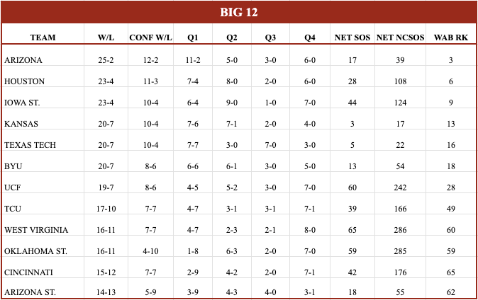 Another first timer on the Watch the Sun Devils have been lurking in the shadows for some time now, but they just hadn’t picked up that big time win that told me they had the stones to go on a run. That was until this past week when they took down Texas Tech. It happened to be the game JT Toppin got hurt, but he played most of that game and Arizona St was in control when he went down, so I think they get full credit for what qualifies as a Q1(A) win right now. That brought them up to 3-9 in Q1, with non-con wins over Texas and Santa Clara being the others they can bring to the table. Those aren’t exactly super strong, but they qualify and with a 4-3 Q2 record they certainly belong in the conversation right now. I do have to mention they followed up the win vs Texas Tech with a road loss to Baylor, so it’s not like they’re white hot like Cincy, but that elite win at least closed the gap enough for them to have a chance. The way I see it, they need to finish 3-1 to be well positioned (not guaranteed in), which would include 2 more Q1 wins as they finish with 3 such games, with a home game vs Utah squeezed in there. It starts on Tuesday night as they go to TCU, which at this point feels like a must-win because in order to finish 3-1 they’d have to win @ Iowa St in the season finale if they lose to TCU. So, it’s very much a long shot, but with how things transpired this past week I’m not counting teams out who have shown a pulse as of late. The Sun Devils qualify, and TCU has been known to lay an egg every now and then, we’ll see if they can steal one.
