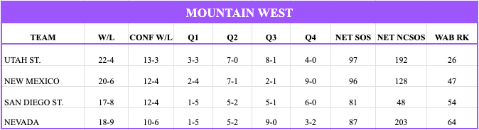 I am pretty confident when I say the worst week on the Watch award goes to the San Diego St Aztecs, as they dropped 2 very winnable Q2 games and have slid fairly far out of this thing. Where they were hanging their hat was the fact they had a clean resumé, but after losses vs Grand Canyon and @ Colorado St, they are down to 5-2 in Q2 vs 5-0 when they started the week. They also still only sport the 1 Q1 win which was @ Nevada, not exactly an elite win. Their only saving grace right now is they’re about to play 3 straight Q1 games, with a home matchup with top-25 NET ranked Utah St up next. I have no hesitation in saying that is a must-win for the Aztecs if they want to contend for an at-large bid. I simply think they have no chance of stacking up with these power conference teams without at least 1 big time win over a top-30 team at least. Right now the Utah St is the only team that can qualify as that in this league, so they have to find a way to grind that one out. After that they go to New Mexico to finish out this week and then to Boise next week. I think at minimum they need to split those games, which would leave them 3-6 in Q1, giving them a chance. So that’s the path forward, and while it’s dark and windy, it remains a path nonetheless.