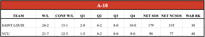 VCU fought valiantly @ St. Louis on Friday night, leading by 9 at the break, but the Billikens were just too much in the 2nd half, as the Rams essentially folded under the pressure of what felt like an avalanche. They really just started turning it over and missing every open shot, even in the paint, as they ended up shooting only 34% on 2 point shots for the game. The 3 ball dried up, and they couldn’t take care of it either, all on top of St. Louis getting hot and dropping 55 2nd half points. It was all too much to overcome, and now they’re just 1-5 in Q1, with the neutral site win over VA Tech barely holding on. They’re right there with St. Mary’s in terms of having very little to show off in the great win category, but they’re 21-3 outside of Q1(A) which is very impressive. I have them just on the outside looking in, and with the remaining schedule I find it hard to imagine they can pass the teams in front of them. They deserve to be on the Watch and apart of the conversation, but if they go into Selection Sunday with their best wins being VA Tech (50th, for now) and USF (52nd) I don’t believe they will be in. With only St. Louis out there as a better win than that, and the A-10 finals being the next shot at them, you can see the conundrum. They basically need every other bubble team to collapse and for VA Tech and USF to go on big time runs to charge into the 40’s overall. That’s their path, win out and hope for mass chaos to everyone not named VA Tech/USF. Not too much to ask for is it?