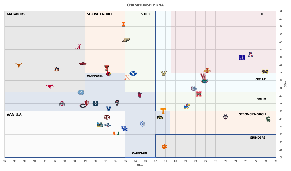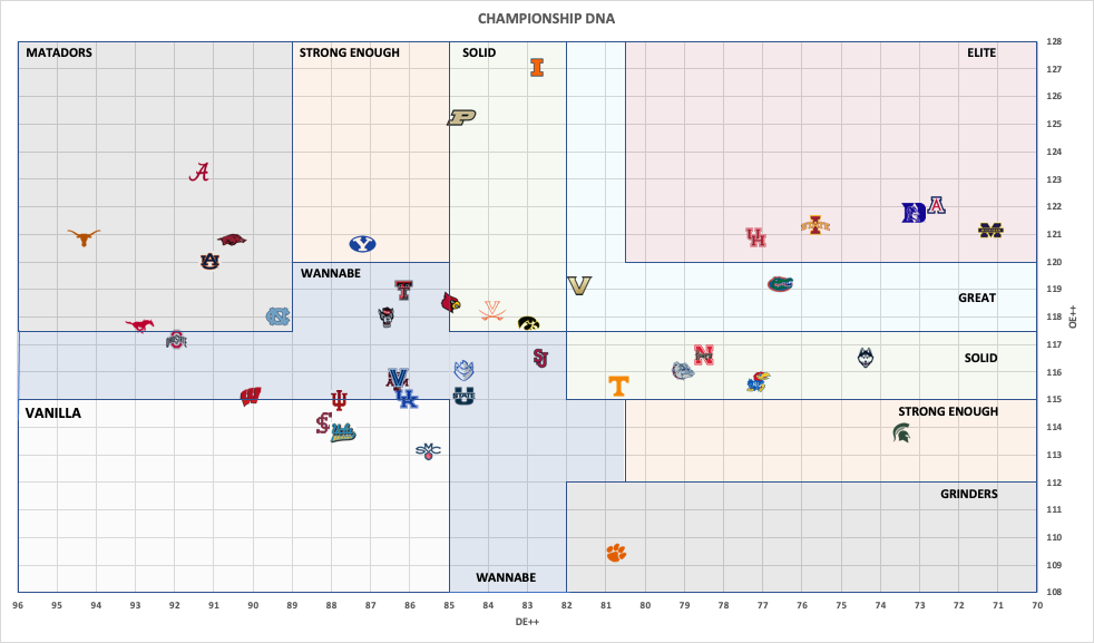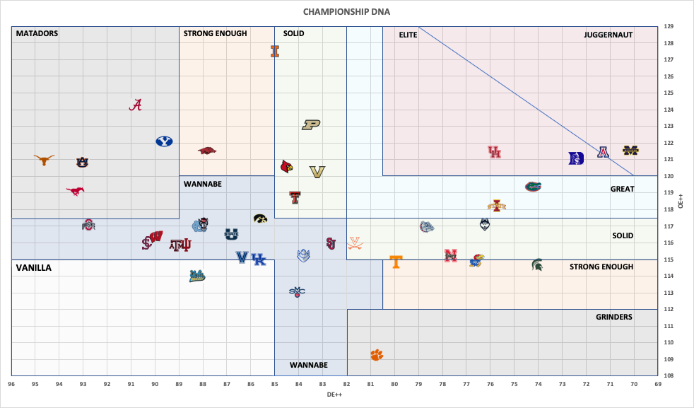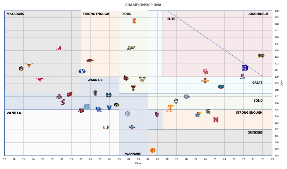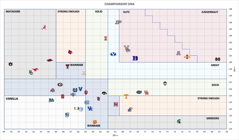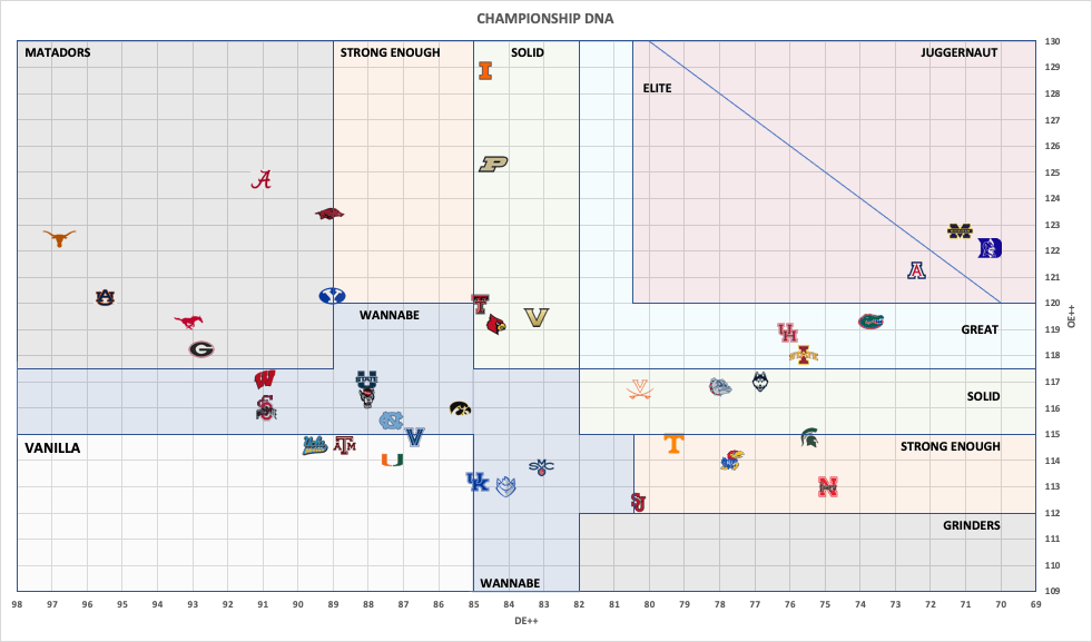 It is also important to point out how the juggernaut watch has evolved, with my pointing out midway through the season that Michigan was tracking for an all-time season. That was point of adding the line, as only 5 teams since 2002 have entered the tourney above it, and all 5 made the Final 4, with 3 getting to the title game. Since then, we’ve seen Arizona flirt with that line and now Duke has surged into Michigan territory, legitimizing any opinions that it’s a 2 horse race. Arizona is still right there though so I wouldn’t completely agree with that theory. My final thought on where we are right now is that the best 3 defensive teams in the country are 1-2-3 right now. In a landscape where offensive efficiency has exploded, being able to get consistent stops has become the key standout ability these days.