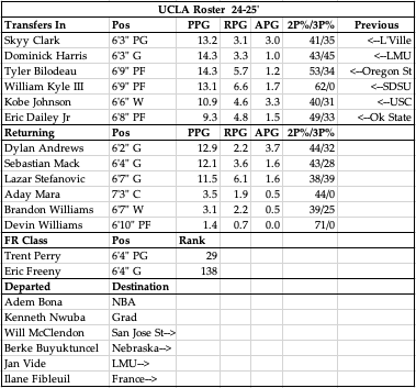 The Mick Cronin era at UCLA has been largely a success, with 3 trips to the tourney in the 4 chances he’s had, resulting in a Final 4 run and 2 Sweet 16’s. Pretty damn good, but last year was the first bit of turbulence we’ve seen as it never really came together for what was an extremely young group. It appears Cronin is making a bit of a pivot, as last years roster included 7 top-100 FR and just 4 upper classmen, and it showed. This year he’s gone to the transfer portal to boost the talent level, with just 2 FR incoming. I think the days of bringing in large FR groups and competing right away are a thing of the past (unless you’re Duke), and the veteran transfers are becoming more and more valuable, and to Cronin’s credit, he’s adapting. He has some really talented returnees from last year’s group with double digit scorers DylanAndrews, SebastianMack and LazarStefanovic all back in the backcourt. Mack is joined by 3 others from last years class to stick around as well, with AdayMara and Brandon and DevinWilliams all back to try and make a SO jump. However, after the disappointment of last season nobody’s role is safe, nobody should feel comfortable. There are legitimately multiple guys who can be a starter at each position, so let’s dive into it. In the backcourt it’s Andrews and Mack, guys who led the team in scoring but in a rather inefficient way who will battle with SkyyClark from Louisville, who is likely the most suited guy at PG on the roster, albeit far from a pass first kind of player. He is a gifted scorer and shot better from 3 than either Andrews or Mack, so he should figure to fight for that spot if he can defend up to Cronin’s standards. Next is Gonzaga–>LMU transfer DominickHarris, who shot a blistering 45% from 3 last year in his breakout year after seeing limited minutes with the Zags years prior. Lastly, there’s incoming top-30 FR TrentPerry, who at 6’4″ has great length for a PG and is a gifted shooter. He’s not the quickest or most explosive, so he may need a year with Cronin to break through, especially given all this talent in the backcourt. The 3 spot is equally as important, and Cronin brought in some competition there as well for returning starter Stefanovic to contend with. KobeJohnson should play a role, and given his size and rebounding ability should get minutes whether as starter or backup, he just isn’t quite the shooter that Stefanovic is. The 4 and 5 spots are a complete toss up, with returning guys Mara and Williams both having started occasionally there last year but incoming transfers TylerBilodeau, WilliamKyleIII and EricDaileyJr will all be battling them for minutes. Iron sharpens iron clearly the motto here.