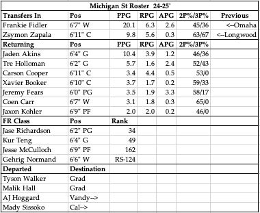 It’s the beginning of a new era of sorts for Izzo and co. as a group exits the program after years of never quite living up to the hype. The likes of Hoggard, Hall, Sissoko and Walker went four years of entering the season with major hype and never winning more than 11 games in conference and no better than a 7 seed in the dance, which by Izzo standards is a disappointing stretch. He has broken through to the Final Four with almost every major recruiting class he’s had, dating back to runs with Morris Peterson (2000), Alan Anderson (’05), Draymond/Lucas (’09-’10), Denzel Valentine (’15) and Cassius Winston (’19). Those guys were leaders among that era’s group of guys that came in, developed and eventually went on their run to the Final 4. This last group never saw such a run, so Izzo will once again try and develop another young group, all the while this old school way of doing things becomes more and more castigated. Izzo will of course remain steadfast regardless, and with last year’s group of FR returning in Booker, Fears and Carr as top-50 recruits, joined by this year’s 2 top-50 guys he has the young horses to go for it with another group for what may be his final few years at the helm. Overall Sparty returns 7 guys from last year including JadenAkins who averaged double figures and should start this season in the backcourt. Fears and TreHolloman should also join that backcourt rotation along with exciting FR JaseRichardson. The 6’2″ G is a lanky, quick twitch guard who loves to get downhill and finish at the rim. He reminds you of a young De’Aaron Fox, with a wiry frame and smooth handles, he can be a lethal scorer if his jumper comes along, but already has a great ability to beat defenders off the bounce and finish in the paint. The other FR who figures to find a role is KurTeng, who at 6’4″ with his strength could play the 2 or 3 just like Akins. He is a smooth scorer of the ball, mostly as a catch and shoot guy though as opposed to Richardson who can create for himself and others. Then there’s the Malik Hall replacement in transfer FrankieFidler. Although not quite as physically imposing as hall, Fidler was one of the best mid-major scorers in the country last year. He most likely will play the small ball 4 spot, but Izzo has the depth in the frontcourt to play big as well with Fidler or Coen Carr at the 3. The frontcourt is all about development, as the same rotation of Booker/Cooper/Kohler will be battling for minutes at the 5 and even the 4.