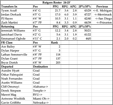 We’ve become accustomed to Steve Pikiell coached teams looking a certain way, horrific offensively but lockdown defensively with a grind it out mentality that tested every Big Ten teams resolve. It hasn’t really manifested much postseason success though, with just 1 tourney win in 8 seasons, albeit still a big step forward from the basement dwelling days that preceded him. Pikiell has addressed the major issues that have plagued Rutgers on the offensive end in about as dramatic a way as you can, and as shocking as it may sound the Scarlet Knights might have the most exciting group of newcomers the Big Ten has to offer. Every sane person who pays attention to college hoops would say expectations for this team should be higher than they’ve ever been, but it is going to look far different than we’ve seen in the past, with a likely smaller, more athletic lineup than we’ve ever seen. Dare I say watching Rutgers may actually be an enjoyable experience this season? It would be silly to not start with the obvious here, so let’s talk about the two 5-Star Freshmen taking Rutgers by storm. First is 2nd ranked AceBailey, a 6’8″ wing who can play the 3 or 4, and likely will be the 4 given this roster construction. He is a freak athlete that is deadly in transition as well as on the downhill attack in the half-court. His jumper shows promise, but in his likely lone year at Rutgers he is going to be a menace at the rim on both ends of the floor. Next is 6’5″ G DylanHarper, brother of former Scarlet Knight Ron Harper Jr, who figures to come right in and be the leading playmaker for this Rutgers team. He’s not the explosive athlete that Bailey is but he’s a true 3 level scorer, who on top of his ability to put the ball in the net is a plus passer and a willing passer as well. His ability to create in the half-court, and hopefully orchestrate in transition, is going to be a welcome change of style for this Rutgers program. Those two have to come in and start, and JeremiahWilliams should join them after his breakout a year ago. He will battle incoming transfers TysonAcuff and JordanDerkack though, both of whom can really score as well. They also have rotational pieces that shot 40% from 3 in Hayes and Martini transferring in that can help off the bench. That leaves the 5 spot, and that’s where it gets murky. The loss of Omoruyi is what kept Rutgers at 5th and not higher, as there’s not a lot of meat on this roster inside. They have returning role player EmmanuelOgbole, who at 6’11” is the obvious fit, but FR LathanSommerville is an interesting prospect to watch. Although he’s a bit undersized he plays bigger than his height, and despite a lack of explosiveness as an athlete he has craft to his game and good touch inside to go along with a high motor.