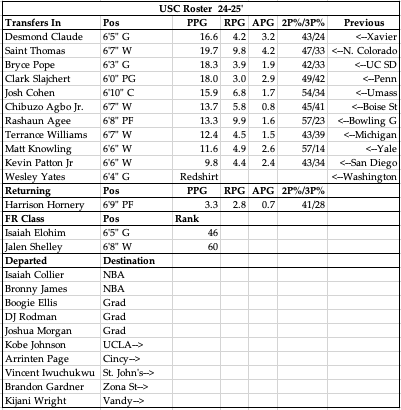 Well this is the biggest, most extreme rebuild that is happening in college basketball right now, with the move to the Big Ten, just 1 returning scholarship player from a year ago and a new HC in Eric Musselman the program is completely reset. As he often does the Muss Bus has gone heavy into the transfer portal, bringing in 11 transfers along with 2 FR to give him 14 guys to work with in LA. Muss has brought in an astounding amount of production, with 5 guys who averaged 15+ ppg a year ago and 4 more that also averaged double digit scoring. He has an array of positional talent, from an 18/3/3 PG Slajchert to a 6’10” C Cohen who averaged 16 and 7 inside. There’s power conference talent like DesmondClaude and TerranceWilliams, a Mountain West standout in AgboJr and even Ivy league guys. It’s a diverse hodge podge of talent, that if brought together could be an extremely dangerous team in the Big Ten, and Nationally. However, I’ve been fooled by Muss and his accumulation of talent via the portal recently, as last year’s group never came together. So, there’s cautious optimism, as the on paper talent will only take you so far. Muss has had tremendous success in his career building programs quickly, but in both his stops at Nevada and Arkansas he missed the dance in year 1. So, we may want to have some patience, although he never had the resources or open free agency via the portal in those years, so in some ways this is unprecedented even for him.