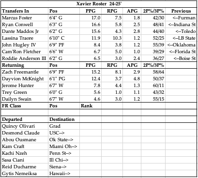 Well we head from one extreme to the other as we move from Marquette to Xavier, going from a team with zero transfers and only FR entering the program to zero FR and only transfers coming in. Sean Miller has gone all in on reloading year to year in the transfer portal, and after missing the tourney last year you have to wonder how the up and down nature of that strategy will fair over the long term. The good news is he gets ZachFreemantle back after missing all last season, and DayvionMcKnight is back to lead the offense at the point. With those two to build around you start looking at the portal guys and there are some very solid mid-major transfers that have a chance to have major roles here. RyanConwell is a perfect fit as a scorer that shot at an elite level from 3, and right with him is DanteMaddox from Toledo as both were 40%+ from 3 a year ago. MarcusFoster can also really score, and is a little bigger so he could even play a small 3 if they need, but he has been much more inefficient so I would think he falls to 4th on the guard list and that’s not even mentioning now SO TreyGreen who had moments last year. Cam’Ron Fletcher appears at another school as the former top-50 prospect lands at his 3rd destination for his 5th season, and while he’s never really grown much he can contribute at the 3 if Miller needs to go bigger there. Inside it’s pretty straightforward with 4 guys who can play the 4/5, with Freemantle leading the way and JeromeHunter back as a former starter for Miller at the 4. The transfers are interesting though, as JohnHugley was a big time player for Pitt back in 2022 averaging nearly 15 and 8. Traore himself averaged a double double last year so there’s tremendous depth there and iron sharpens iron so I expect a strong unit with all 4 guys contributing.