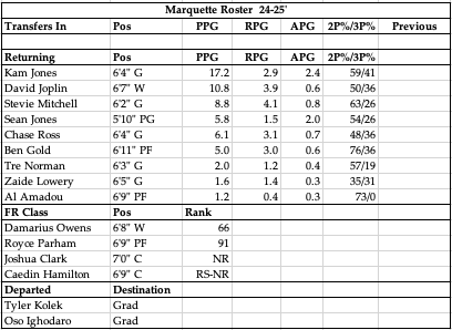 I love what Shaka Smart is doing at Marquette, as the old school approach of recruiting and helping develop guys who you then go win with at a high level is disappearing before our eyes. Marquette is just 1 of 2 major conference programs to not bring in a transfer, and joins UConn as the only Big East teams to not lose a player to the portal. Now I’m not wholly against using the portal to improve your team, especially if you have major holes, but there’s something to be said for the cohesion that this brings and the advantage that can give you in today’s college basketball world. It also helps avoid losing guys to the portal, as that often occurs when guys don’t see a role for them after a year or two of sitting because they keep getting passed up by transfers coming in. It is obvious this is the type of situation Smart thrives in, as he can treat it more like VCU than Texas, where he could get more talented FR but they would leave much quicker. Shaka has these guys believing in their process, waiting for their opportunity and is honoring that by allowing these younger guys the opportunity to fill the void left behind by Tyler Kolek and Oso Ighodaro. That’s a massive void however, and while I admire the process and think log term it’s a positive, they have quite a task ahead of them trying to replace those guys. The good news is KamJones is back to lead the way, along with other vets DavidJoplin and StevieMitchell. Jones and Mitchell will be joined by a solid group of younger guys in the backcourt with guys like ChaseRoss, Tre Norman and SeanJones all showing promise so far in their young careers. Fairly obvious the backcourt will be fine even with the loss of Kolek, but the frontcourt is where things could get dicey without Ighodaro. BenGold is the obvious plug in as the 5, but he’s a bit different than Oso as he’s not quite the rim protector or rebounder but can stretch the floor as a knockdown shooter. Joplin will be the 4, but behind those guys is a void with a bunch of unproven youth. DamariusOwens is a lanky wing who is a good athlete but will probably need some time to develop. It’s likely RoyceParham or AlAmadou backs up Ben Gold, and both are lanky bigs with good athleticism so one of them should emerge as the backup and produce.