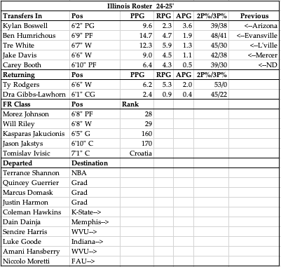 Brad Underwood has gotten this Illini program back in a position of power in the Big 10 over the last 4 seasons, going 56-24 in Conference (1 co-championship and 2 runner up finishes), making 4 straight NCAA tourney’s and finally getting a breakthrough in the dance a year ago with a trip to the Elite 8. That is a run that you would expect to yield some real roster strength and a ton of returning talent, but that is not what we’re seeing entering this season. 10 players have left the program, with 6 by way of transfer, which is quite surprising for a program that’s experiencing success over a sustained period. Nevertheless it’s the reality, and Underwood is now tasked with rebuilding essentially the entire roster, with just 8 ppg returning from last year’s group it’s a new chapter for he and the Illini. Of course, just as the transfer portal taketh, it can also giveth, or something like that, and Underwood has brought in some intriguing talent, most notably PG KylanBoswell and W TreWhite. Those 2 are going to have to lead the show as they are really the only 2 proven producers at the power Conference level, but neither have ever been a number 1 option. The wildcards are the Europeans. We’ll start with big man from Croatia TomislavIvisic, who at 7’1″ looks to have a game similar to current star in college hoops Hunter Dickinson. He has a good post up game, with a hook shot to either hand, but can also stretch out and hit 3’s. He’s not a physical bruiser or some sort of elite rim protector, but in the Dickinson vein has the potential to be a high volume producer at the 5 spot. The other is KasparasJakucionis who is a sharpshooting guard that has everyone excited. He’s not only a shooter as he can get to the bucket and finish with the best of them, but I’m interested to see how it translates to this level, as he’s not the most athletic and his shot is also pretty slow, but he should definitely play and be a shooting threat, even if he’s a liability on D. There’s also the incoming FR, with MorezJohnson being a little less of a natural pairing with Ivisic, as he is an undersized back to the basket guy himself. I would expect WillRiley to have more potential to play a significant role, as at 6’8″ he can handle the ball like a guard and score at all 3 levels. He has a wiry frame and a game that lacks fundamentals, or any sort of predictability, but resembles something you’d see from the guy at the local park that dominates everyone in the most unorthodox way you can picture. I’m not sure how that shot selection will translate, but he does have sky high potential with his ability to simply get buckets at his size. We know Rogers and he’ll surely have a role, as well as Gibbs-Lawhorn who was playing more and more as the season went on last year. With guys like CareyBooth at 6’10” and lanky, and Humrichous as a stretch 4 Underwood has options to play several types of lineups, whether he wants to go big or surround the big Croatian with 4 shooters and play inside out with him. It’s an intriguing rebuild, but one that has a lot riding on unproven talent, so it’s risky to really believe it’s all just going to come together and produce efficiently enough to compete in a deep and competitive conference.