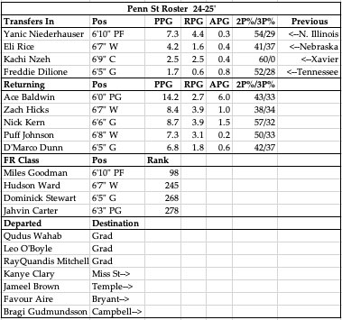 Mike Rhoades actually did a pretty decent job in year 1 trying to rebuild Penn St after their successes under Shrewsberry. Winning 9 games in the Big Ten is nothing to scoff at, especially considering he had to completely overhaul a roster. He also welcomes back a strong core from last year’s team including AceBaldwin who can be an All-Conference guard and 3 more regular starters in Hicks, Kern and Johnson plus regular rotation player Dunn. That’s a solid group of 5 guys that can all come right back and maintain some cohesion after a solid year last year. FreddieDilone is another name to watch in the backcourt as he was a top-50 recruit to Tennessee that just never had the opportunity to show what he can do. The problem that’s keeping them this low for me is this is a group that struggled defensively in the paint and really struggled on the glass. They had just 1 true center in Qudus Wahab and he is gone, with no real proven replacement in sight. They were 282nd in the country in opponent 2 point % and 316th in offensive rebounds allowed, for those of you who require evidence. So, what little paint presence they did have is now gone and the replacements are N. Illinois transfer YanicNiederhauser who averaged a mere 4 rebounds per game, Xavier transfer KachiNzeh who only played sparingly and is undersized and incoming FR MilesGoodman. Goodman barely cracked the top-100 but he does have great length and athleticism, which could help him become a plus rim protector and rebounder. He’s not going to offer much in terms of scoring, but if Penn St wants to replicate their success of last year he may be the key.