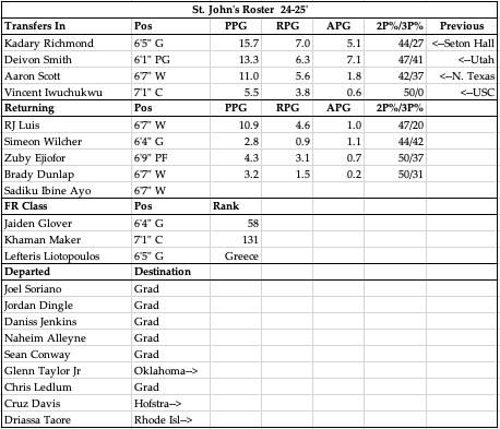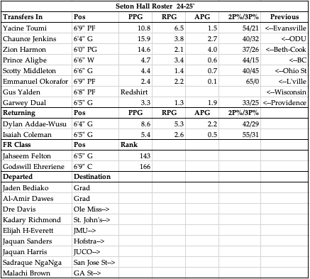 I look for the process to continue to take place under Smart here, as he’s done a great job since arriving at developing his guys and he has a star to build around in Kam Jones. Jones should be right there with Kalkbrenner battling for Big East POY, and with a deep group of talent around him I expect another good season here. The one worry you have is obviously on the glass as it could be even more of an issue than it was a year ago (285th OReb, 270th DReb). So with that said there’s probably a step back defensively without that paint presence. On the other end though Gold is going to open the floor up a ton for these guards being able to play 5 out and drive and kick, which could be a bonus to help level out the loss of Kolek. They went 3-3 without Kolek a year ago, but maybe more important to look at was Jones and his increased level of play. He scored 30+ multiple times and nearly doubled his assist numbers, and to be totally fair 2 of the 3 losses were to UConn and the other was @ Creighton, so really they played pretty well without Kolek. There’s a pretty clear top-3 here and while UConn and Creighton look good there’s enough question marks to see a world where Marquette can win the league. Jones can be that good, and if they can find some production around him consistently this team could be very very dangerous. Don’t sleep on Marquette is all I’m saying, and respect to Smart for building a program the old school way.