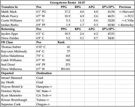 This is a weird situation after Georgetown poached Cooley from Providence despite him looking for so long like a guy who would retire there. He now is in a very difficult situation with a storied program that should be much better than they are. They won just 2 Conference games last year and have just 4 Big East wins over the last 3 seasons (2 of which with Patrick Ewing). There’s no momentum and they get just 2 guys back, which after last season maybe that’s some addition by subtraction. JaydenEpps was their best scorer and creator and he’s back, and he’ll be joined by transfer guard MalikMack who should allow Epps to slide to the off-guard position. MicahPeavy should come right in and start at the 3 and then the front court is going to be wide open. JordanBurks was a good recruit but didn’t play much at Kentucky, and at 6’9″ can play the 4 or 5. FR ThomasSorber is the most promising guy long term on the roster, as he’s a great athlete and has a natural feel for the game. He reminds you a little bit of Trayce Jackson-Davis, as he loves to face up and use his quickness to attack, plays well above the rim and is a great rim protector. KayvaunMulready is the other FR that figures to contribute right away as he can score at all 3 levels and has good size for a guard. He’s not the most explosive athlete but can shoot it and get to the rim. Ultimately there is some real talent here, but that was the case last year so allow me some trepidation.