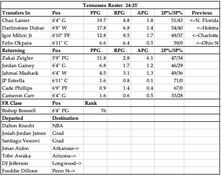 Matt McMahon inherited a disaster left behind by Will Wade’s tumultuous departure, but after a tough year 1 (2-16 in SEC) they took a major step forward going 9-9 last year including a home win over Kentucky. It wasn’t always pretty but they did some good things in what was an overall good season for the program all things considered. There were several major weaknesses that stand out which were devastating as they killed their ability to win the possession battle. They didn’t take care of the ball (287th in TO%) and they couldn’t get a defensive rebound (294th). Much of the backcourt is gone which may be some addition by subtraction, especially considering McMahon was able to land a stud of a PG in JordanSears. He averaged over 20 ppg and they’ll hope he can come in and run the show alongside another transfer in CamCarter. There’s several other options though to fill in the 2 and 3 spots, including TyrellWard and MikeWilliams who both started at times a year ago. There’s also a very talented FR coming in as 6’5″ VyctoriusMiller is definitely going to push these guys for playing time. He is a good athlete for his size but his major weapon is his jumper as he is one of the better shooters in the class. The other FR guard coming in is CurtisGivens who may find some time behind Sears, although Williams played the point at times last year as well. Givens isn’t the most explosive athlete but has good feel and a good jump shot as well, giving you some Elliot Cadeau vibes. The frontcourt should be a bit smaller but more athletic with a trio of returning guys in JalenReed, DerekFountain and DamionCollins making a good trio at the 4 and 5 spots. The other factor there should be FR RobertMillerIII, who is a Jaren Jackson Jr style stretch 4 as he’s long and lanky with good quickness and can stretch out and knock down 3’s. I have no doubt he’ll find time with his ability and that gives them enough depth inside to have a chance after losing both starting 5 men. Overall there is more offensive punch here than a year ago but I’m not convinced this frontcourt is going to improve like they need to on the glass.