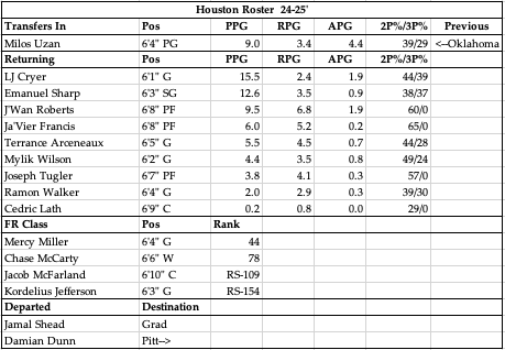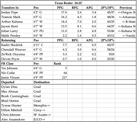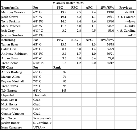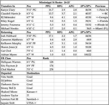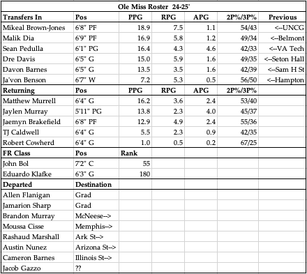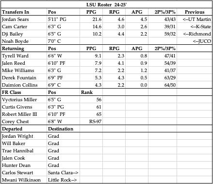 Overall there is more offensive punch here than a year ago but I’m not convinced this frontcourt is going to improve like they need to on the glass. The turnovers should improve with Sears in there to hold things down as a true PG that can also really score it. The group of Carter/Williams/Reed/Miller should be fine but nothing special, and that’s where the concerns start to come in. It is seemingly going to be all on this mid-major transfer Sears to create and make things happen in the halfcourt. That group of secondary guards is not scary by any means, but the good news is they can knock down shots. The frontcourt is also not going to be guys you can get it to on the block and watch go to work. They are more of slashers and bangers inside, needing to likely play in ball screen situations and catch lobs on a roll to be effective scorers. That’s why I think Miller could be a factor as he can stretch out and shoot it in pick and pop or kick out scenarios. That still all rides on Sears being a playmaker in ball screen situations, which is what I would expect to see a lot of. They also are relying essentially on the same group of forwards to somehow improve their 294th ranking on the defensive glass, which is a massive issue as winning the possession battle is critical if you want to win consistently. Overall I just don’t think the additions will be enough to both make up for what was lost and fix some of the major issues they had a year ago. Maybe the guys who are returning will develop and get much better, but something like rebounding is more of an effort and attitude problem than it is an ability you can develop. I suspect this LSU team misses the tourney once again, unless Sears comes in and looks like Bama’s Mark Sears, which I don’t see happening.