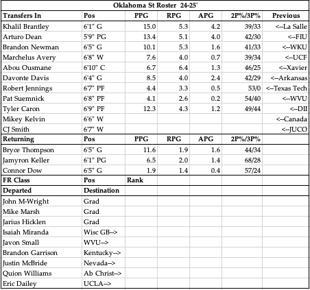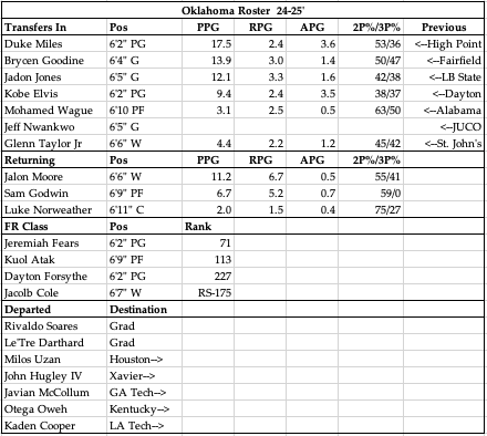 The Porter Moser era at Oklahoma has largely been a disappointment, as they’ve now missed 3 straight tourney’s after reaching 8 out of 9 with Lon Kruger. They now enter the SEC hoping for some reprieve on the hoops side, but this year in basketball they might be in just as tough a situation. This is nearly a complete rebuild, even with 2 starters back when you only return 3 guys you’re basically creating a new team. Yes SamGodwin and LukeNorweather are back after locking down the 5 spot last year, albeit without much production, and Jalon Moore will surely start again. Beyond them it’s all fresh meat and frankly it’s not all that inspiring compared to the other rebuilds the SEC has to offer. DukeMiles should come in and run the point, and KobeElvis is a very capable reserve there as well. They both are elevating the level of competition though so it remains to be seen how well they adjust. BrycenGoodine may be the most exciting, as he was a high volume scorer and shot an absurd 47% from 3, and while he is elevating in terms of competition shooting often translates better than playmaking and getting to the rim as a guard. JadonJones is another mid-major guard coming in, but he’ll likely be surpassed by GlennTaylor who was just a role player last year but in year’s prior was a big time scorer at Oregon St. That group of 5 figures to hold down the 1-3 spots. Coming in to help Godwin and Norweather is MohamedWague who is at his 3rd stop in 3 years and struggled to hold onto a role with Bama last year. All in all it’s not an overly impressive group on paper, and while I do think Moser is a good coach he has his hands full once again.